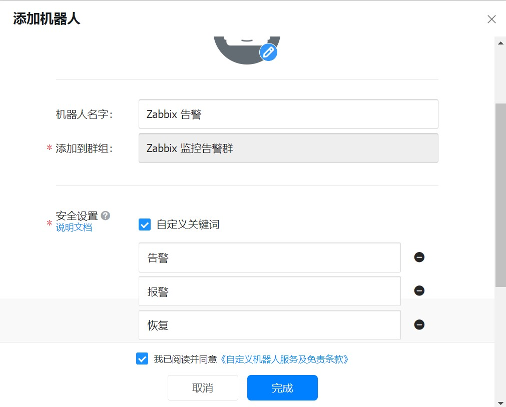 - 设置机器人名称,例如:Zabbix告警机器人。