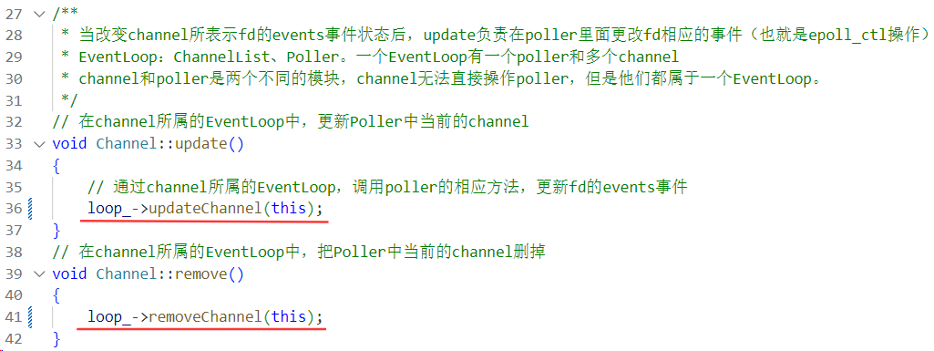 public:using Functor = std::function<void()>;EventLoop();~EventLoop();// 开启事件循环void loop();// 退出事件循环void quit();Timestamp pollReturnTime() const { return pollReturnTime_; }// 在当前loop中执行回调cbvoid runInloop(Functor cb);// 把cb放入队列中,唤醒loop所在的线程,执行cbvoid queueInLoop(Functor cb);// 用来唤醒loop所在的线程的void wakeup();// EventLoop的方法 =》 Poller的方法void updateChannel(Channel *channel);void removeChannel(Channel *channel);bool hasChannel(Channel *channel);// 判断EventLoop对象是否在自己的线程里面bool isInLoopThread() const { return threadId_ == CurrentThread::tid(); }private:void handleRead(); // waked upvoid doPendingFunctors(); // 执行回调using ChannelList = std::vector<Channel *>;std::atomic_bool looping_; // 原子操作的布尔值,底层CAS实现std::atomic_bool quit_; // 标识退出loop循环const pid_t threadId_; // 记录当前loop所在线程的idTimestamp pollReturnTime_; // poller返回发生事件的channels的时间点std::unique_ptr<Poller> poller_;int wakeupFd_; // 主要作用是:当mainLoop获取一个新用户的channel,通过轮询算法选择一个subLoop,通过该成员唤醒subLoop处理channelstd::unique_ptr<Channel> wakeupChannel_;ChannelList activeChannels_; // 活跃的channel列表,存储poll调用返回的有事件发生的channelstd::atomic_bool callingPendingFunctors_; // 标识当前loop是否有需要执行的回调操作std::vector<Functor> pendingFunctors_; // 存储loop需要执行的所有的回调操作std::mutex mutex_; // 互斥锁,用来保护上面vector容器的线程安全操作