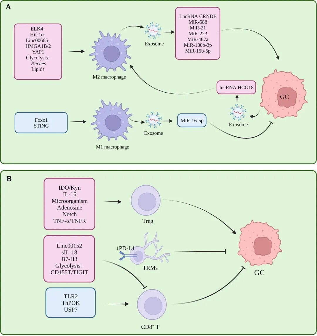 浸润TME的巨噬细胞被称为肿瘤相关巨噬细胞(Tumor associated muscells,TAMs),包括两种极化状态,即具有抑癌功能的经典M1极化和具有促肿瘤功能的M2极化。在GC中,TME诱导TAM的M2极化,抑制M1极化是形成免疫耐受的重要因素之一(图3A)。
