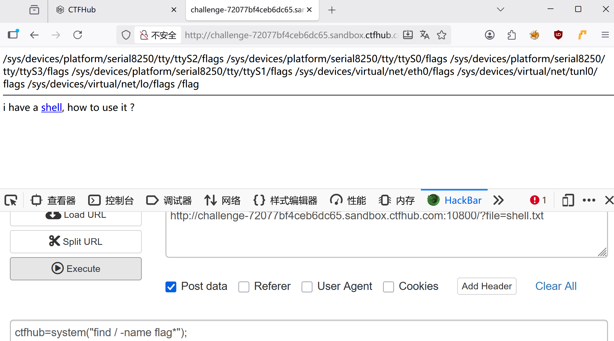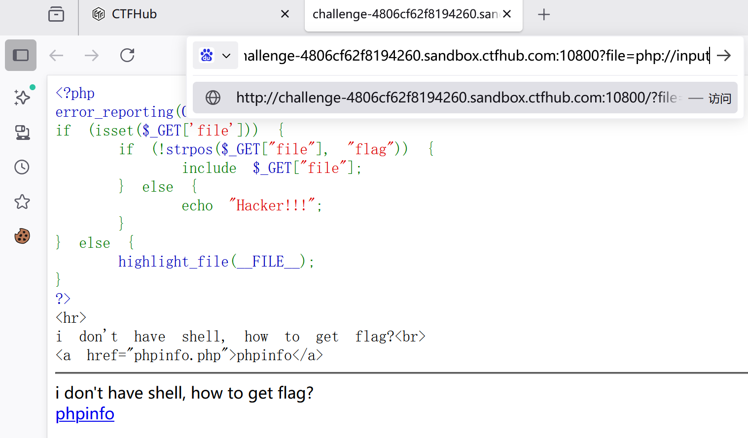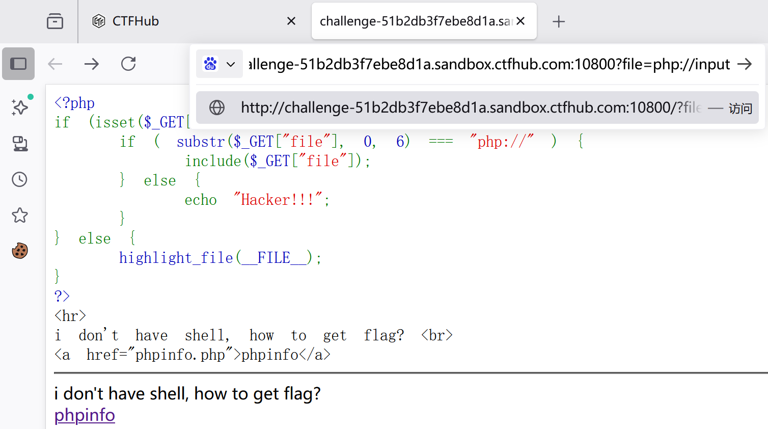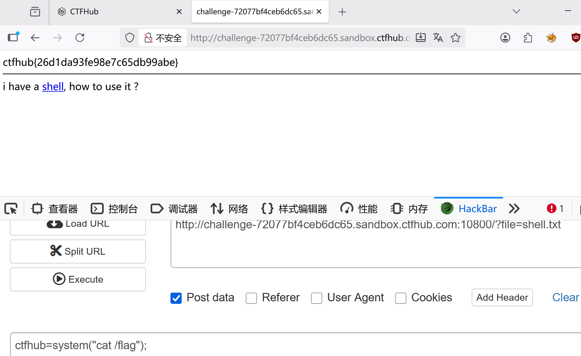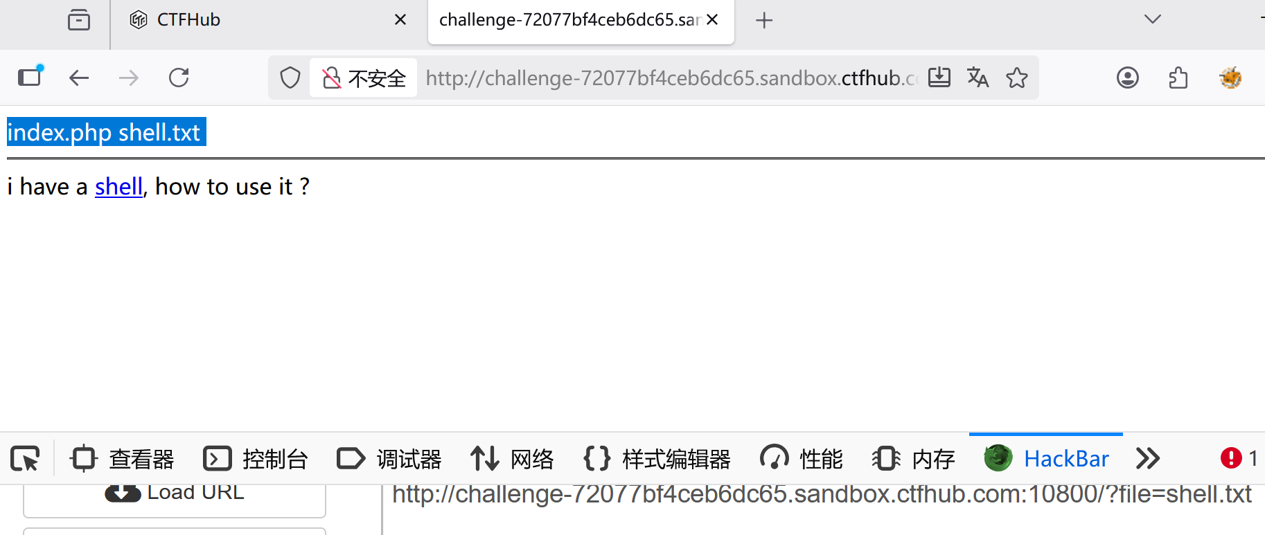 http://challenge-72077bf4ceb6dc65.sandbox.ctfhub.com:10800/?file=shell.txt