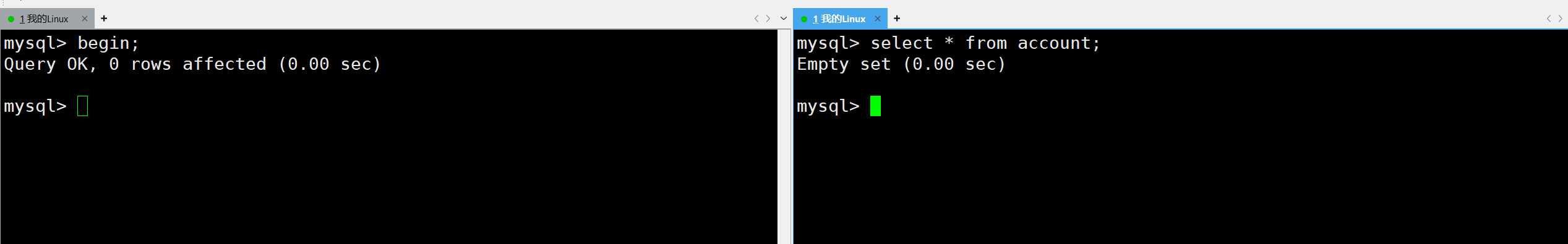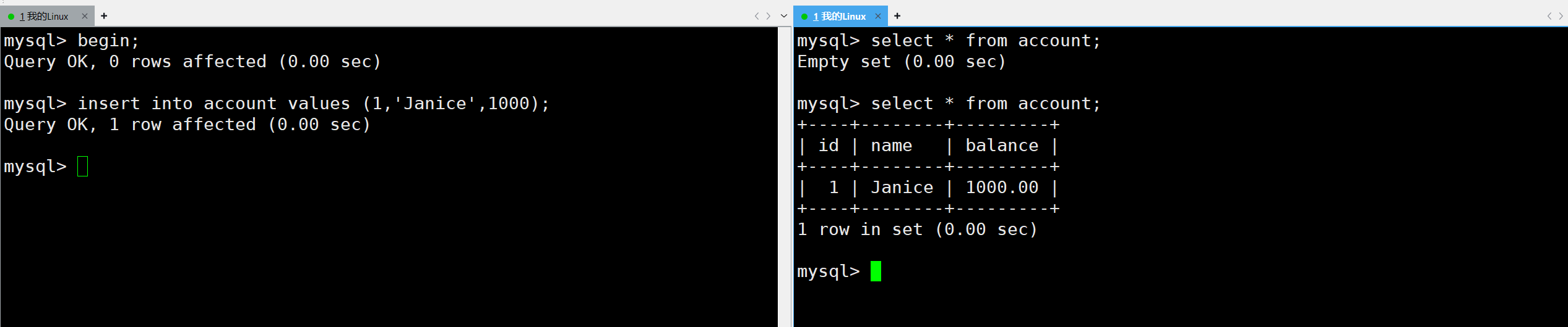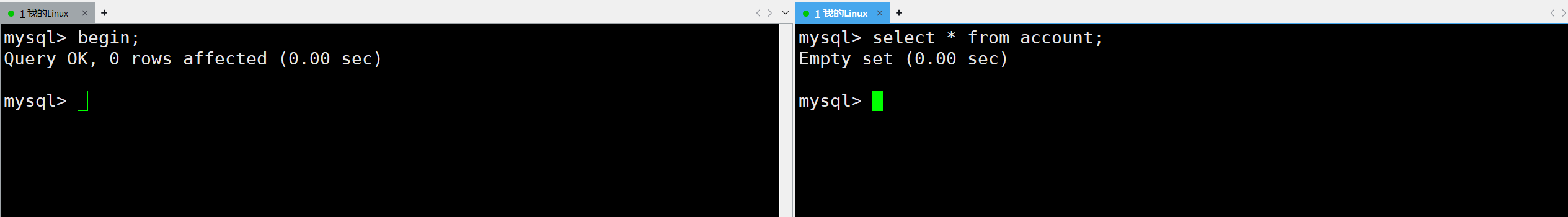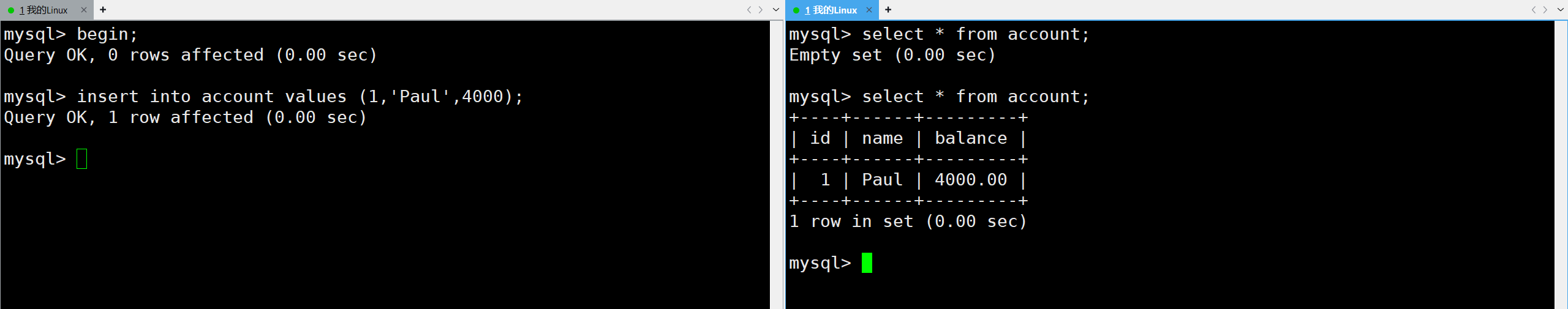 在两个终端各自启动一个事务,左终端中的事务所作的修改在没有提交之前,右终端中的事务无法看到。如下: