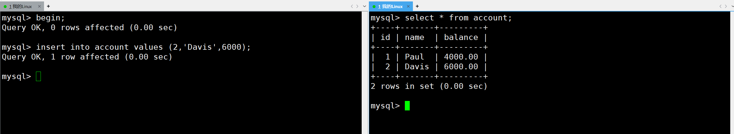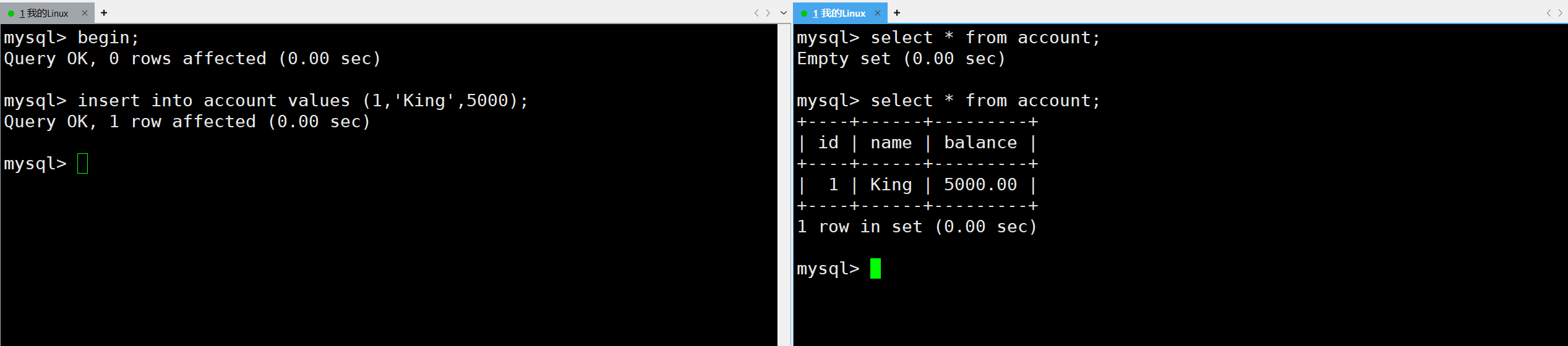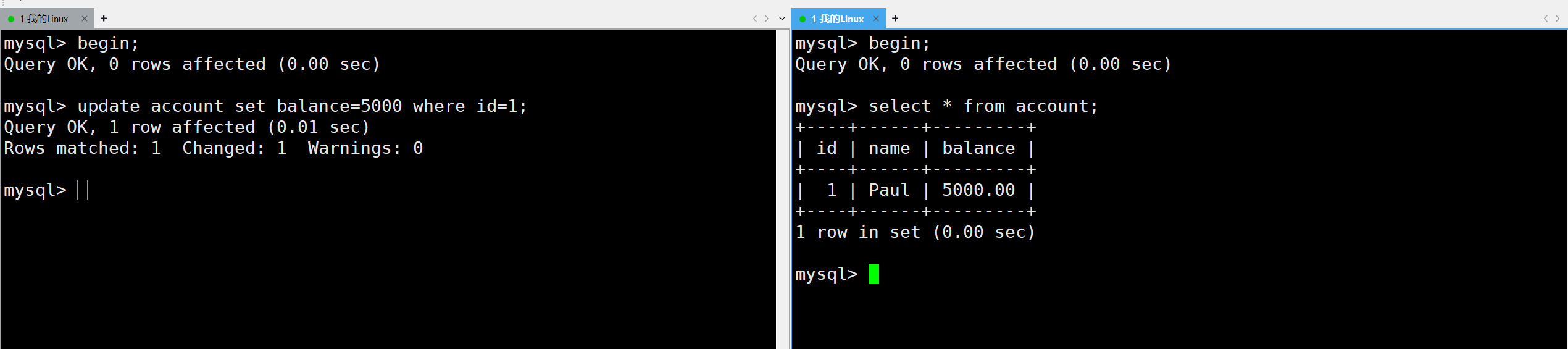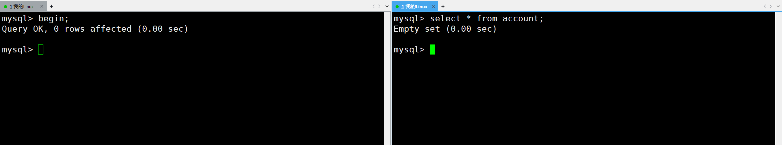 在两个终端各自启动一个事务,左终端中的事务所作的修改在没有提交之前,右终端中的事务无法看到。如下: