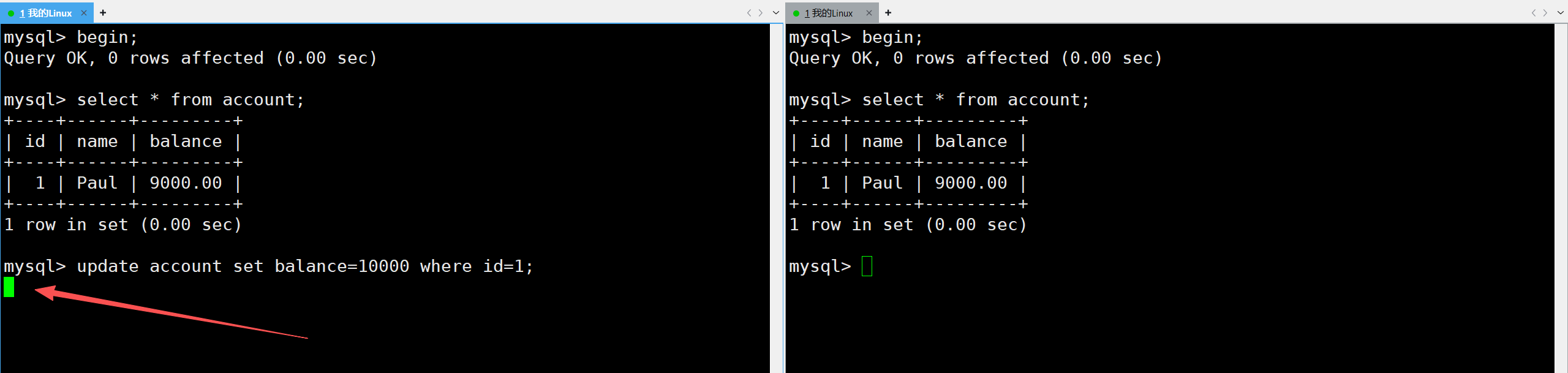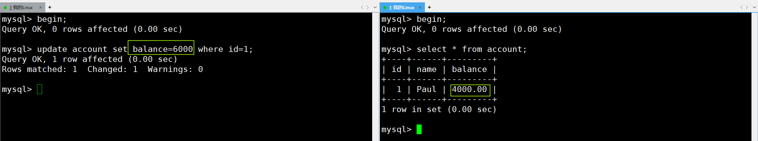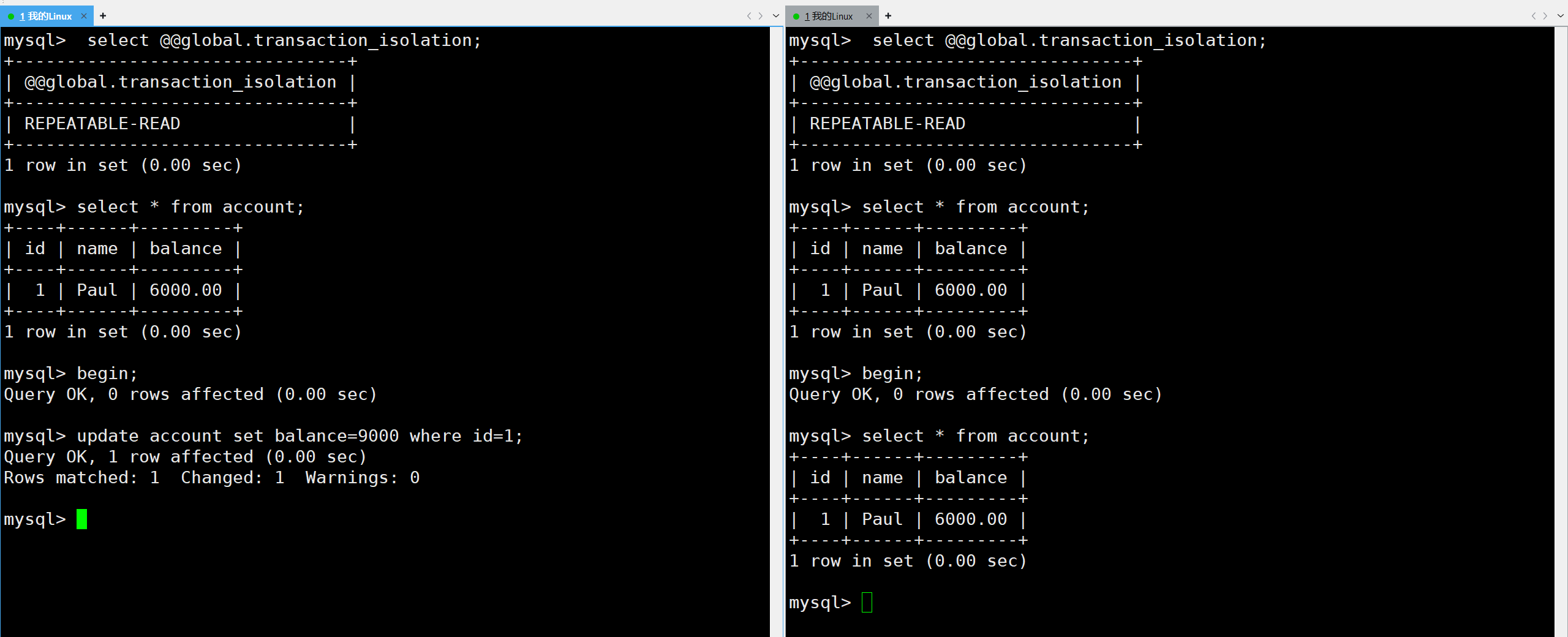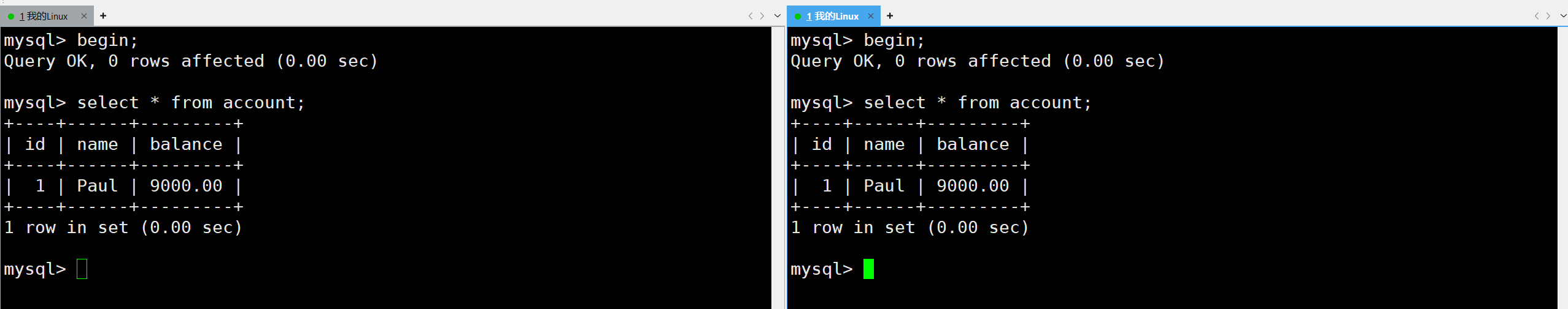 启动两个终端,左终端使用begin或start transaction命令启动一个事务,右终端查看银行用户表中的信息。如下:
