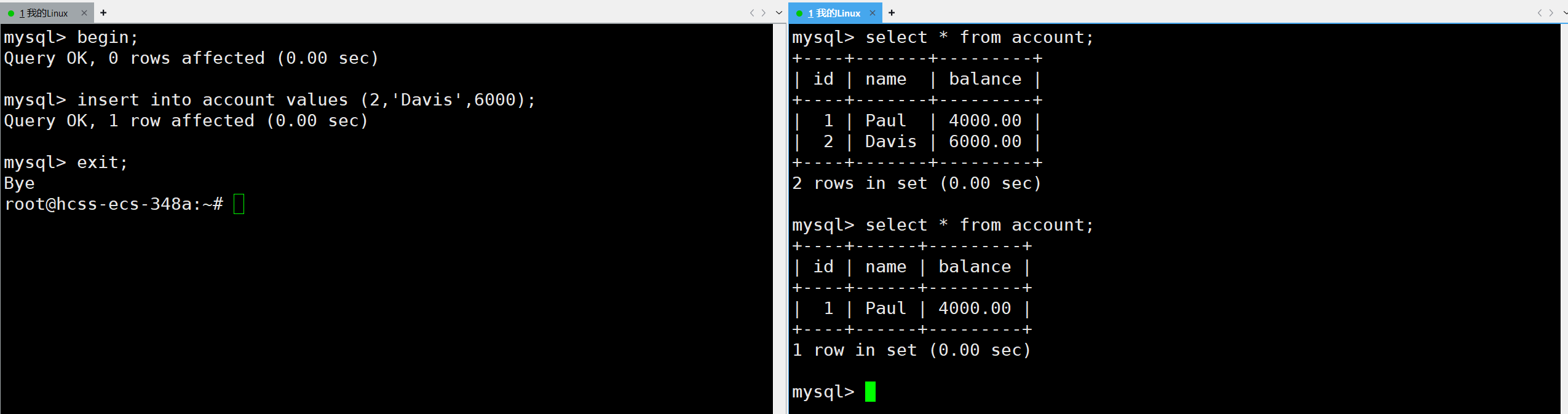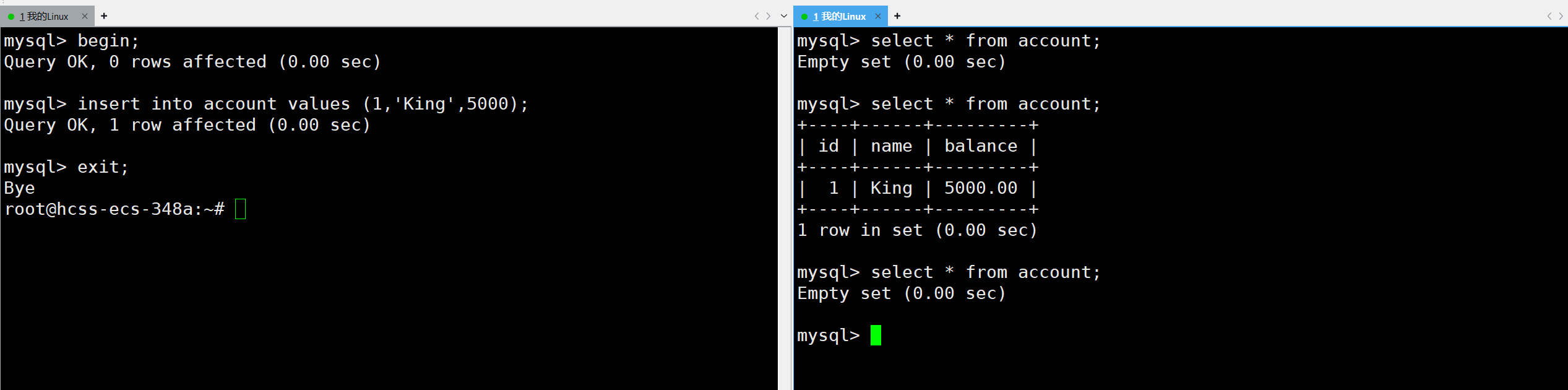 如果左终端中的事务在提交之前因为某些原因与MySQL断开连接,那么MySQL会自动让事务回滚到最开始,这时右终端中就看不到之前插入的记录了。如下: