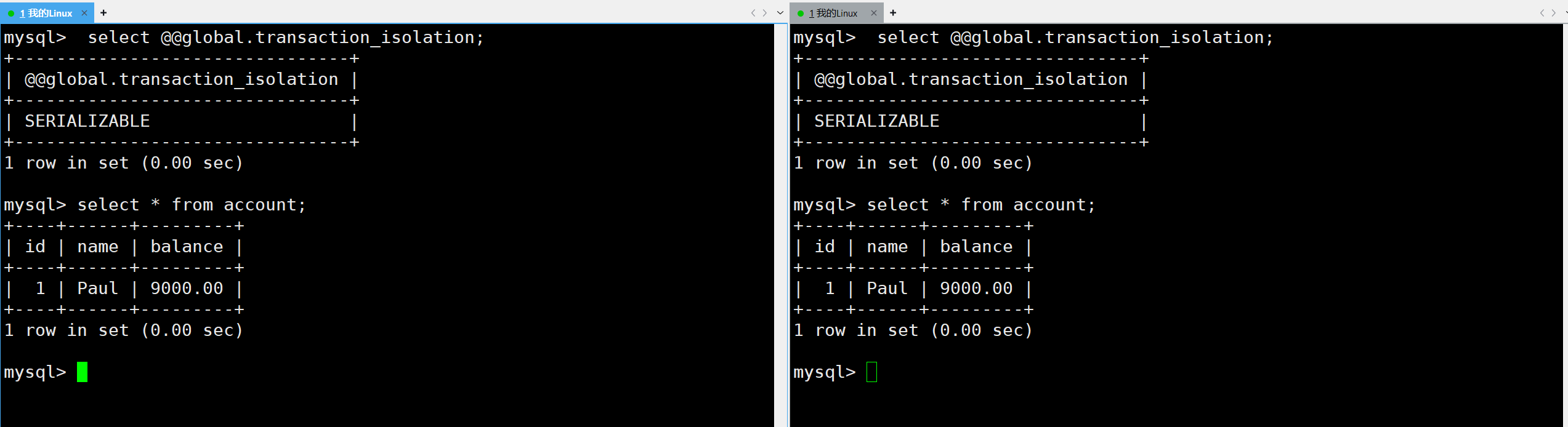 启动两个终端,将隔离级别都设置为串行化,并查看此时银行用户表中的数据。如下:
