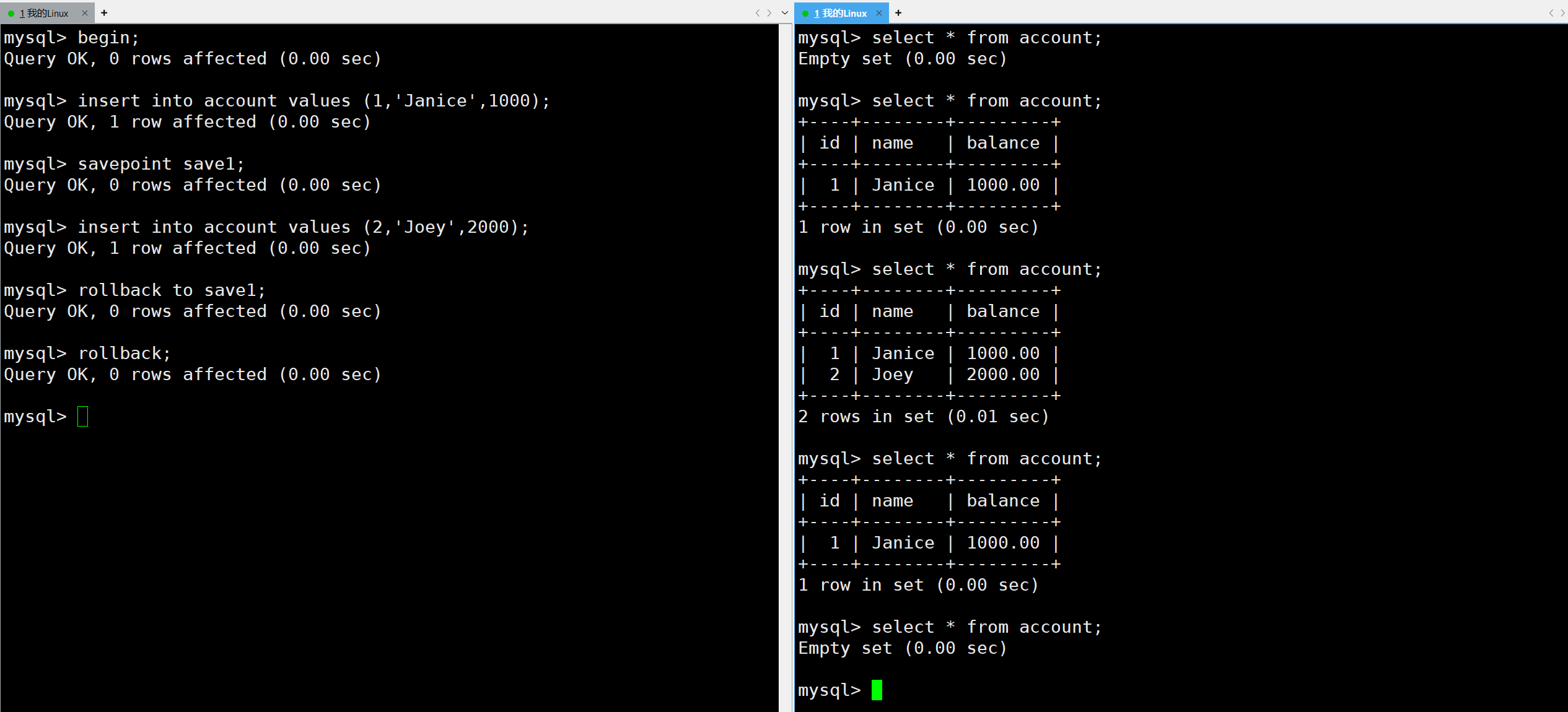 3. 使用”rollback to 保存点“命令,可以让事务回滚到指定保存点。