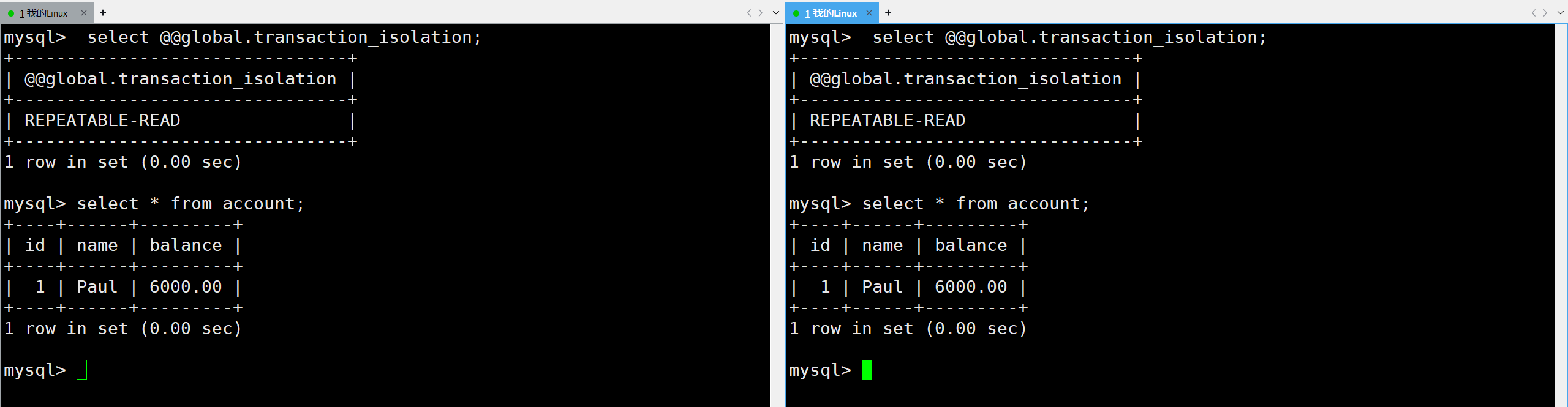 启动两个终端,将隔离级别都设置为可重复读,并查看此时银行用户表中的数据。如下:
