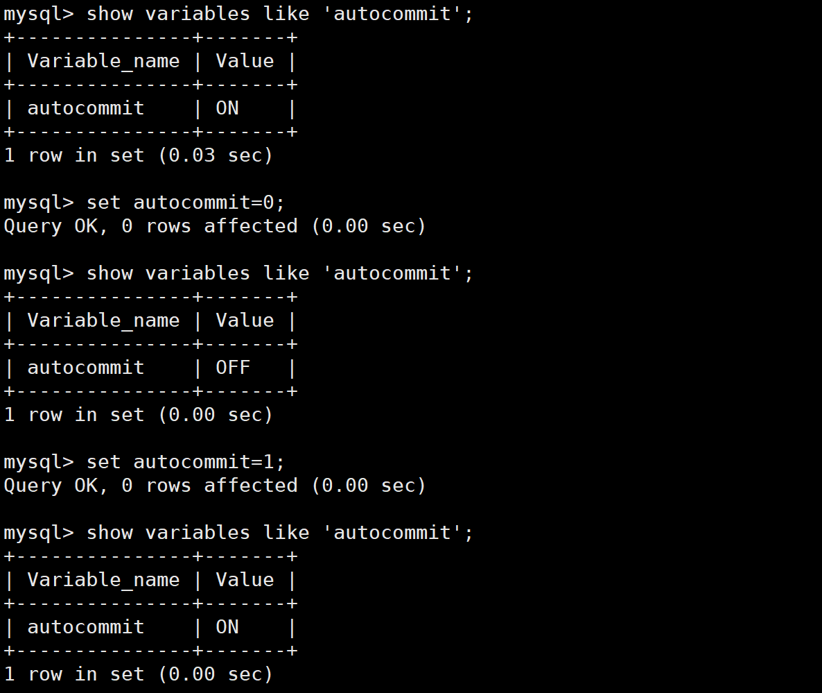 通过set命令设置autocommit全局变量的值,可以打开或关闭事务的自动提交。如下: