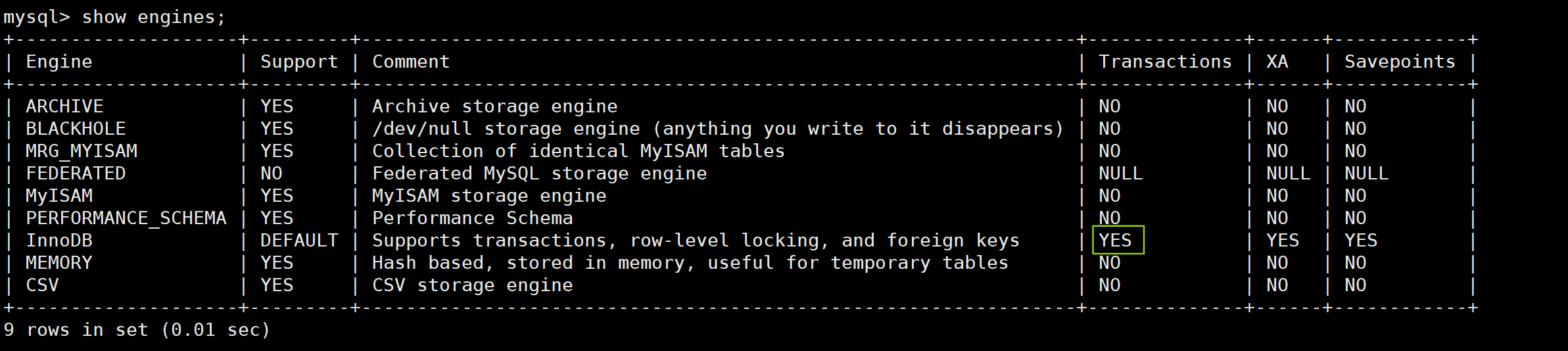 - Transactions: 表示存储引擎是否支持事务,可以看到InnoDB存储引擎支持事务,而MyISAM存储引擎不支持事务。