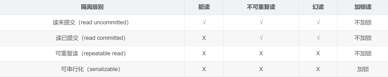 - 表中只写出了各种隔离级别下进行读操作时是否需要加锁,因为无论哪种隔离级别,只要需要进行写操作就一定需要加锁。