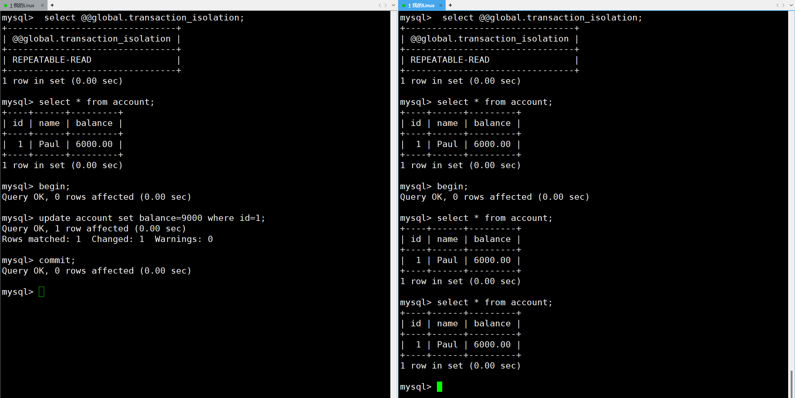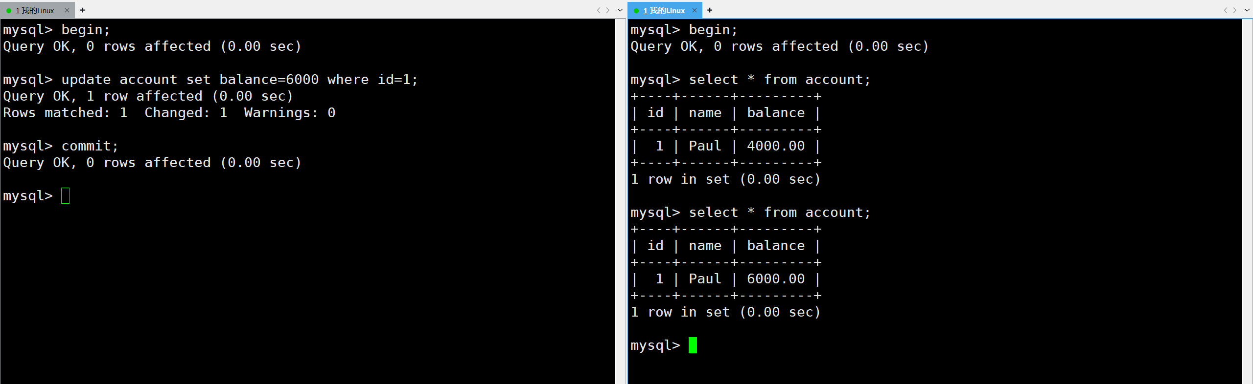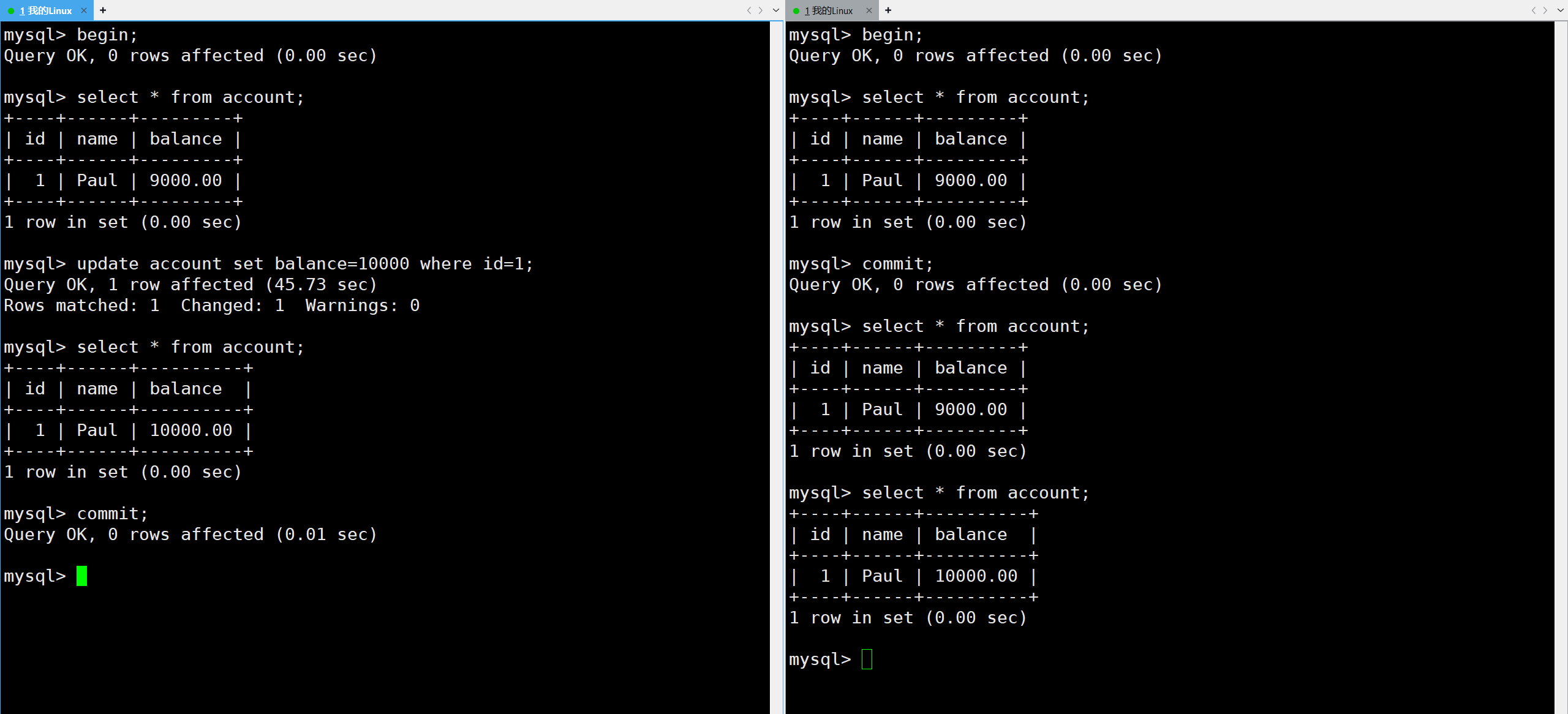 只有当左终端中的事务提交后,右终端中的事务才能看到修改后的数据。如下: