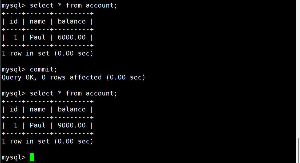 只有当右终端中的事务提交后再查看表中的数据,这时才能看到修改后的数据。如下: