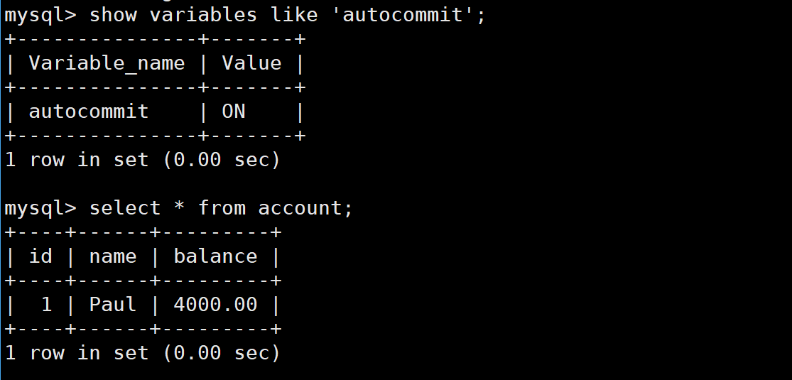 通过show命令查看autocommit的值为ON,表示事务的提交方式是自动提交,此时银行用户表中有一条记录。如下: