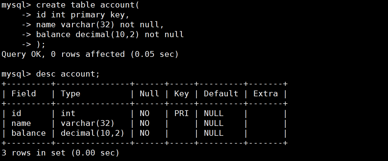 创建一个银行用户表,表中包含用户的id、姓名和账户余额。如下: