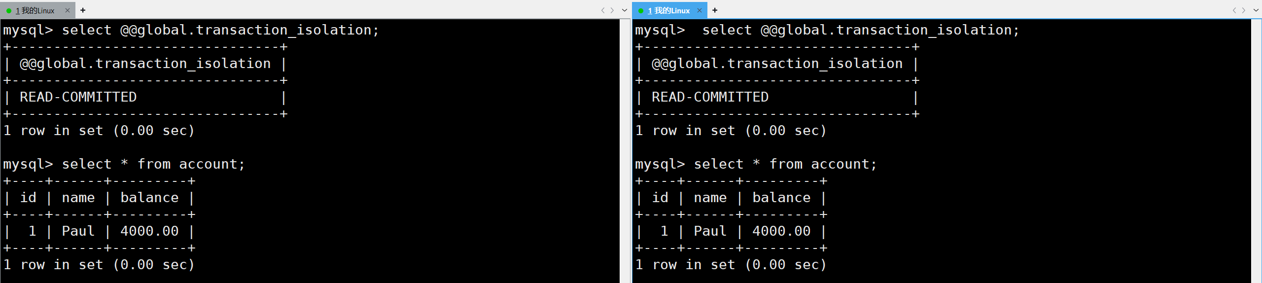 启动两个终端,将隔离级别都设置为读提交,并查看此时银行用户表中的数据。如下: