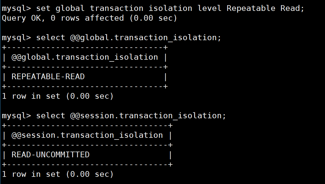 通过”set global transaction isolation level 隔离级别“命令,可以设置全局隔离级别。如下: