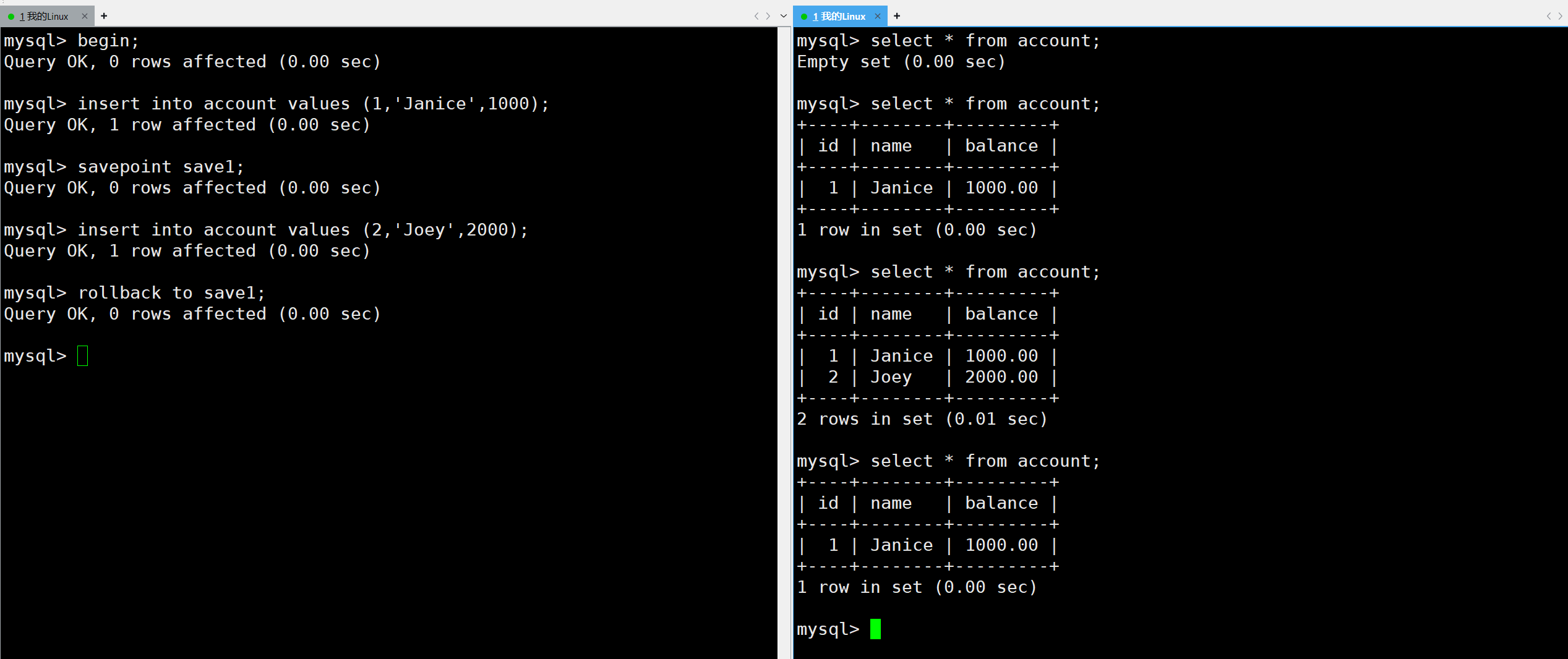 左终端中的事务使用rollback命令回滚到保存点,这时右终端在查看表中数据时就看不到刚才插入的第二条记录了。如下: