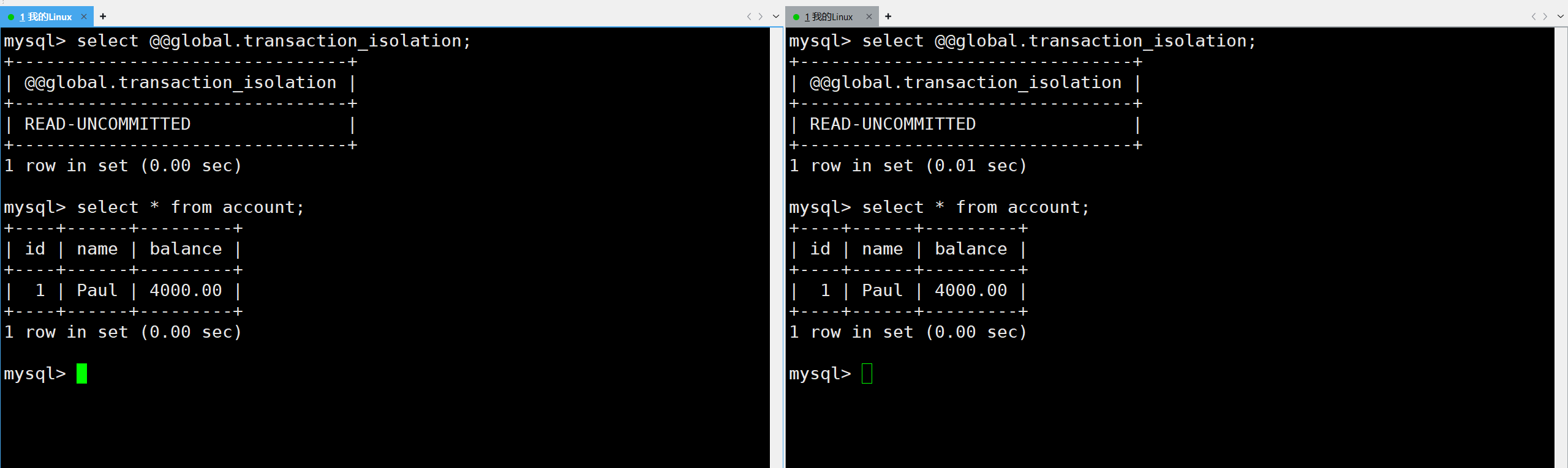 启动两个终端,将隔离级别都设置为读未提交,并查看此时银行用户表中的数据。如下: