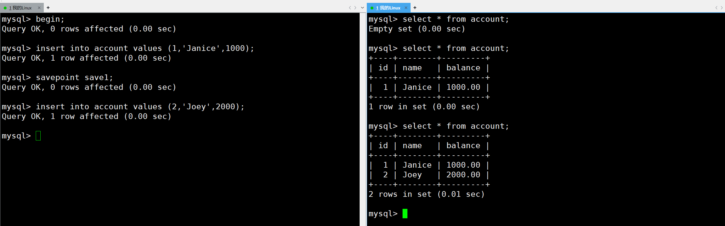 左终端中的事务使用savepoint命令创建一个保存点,然后继续向表中插入一条记录,这时在右终端中也能看到新插入的这条记录。如下: