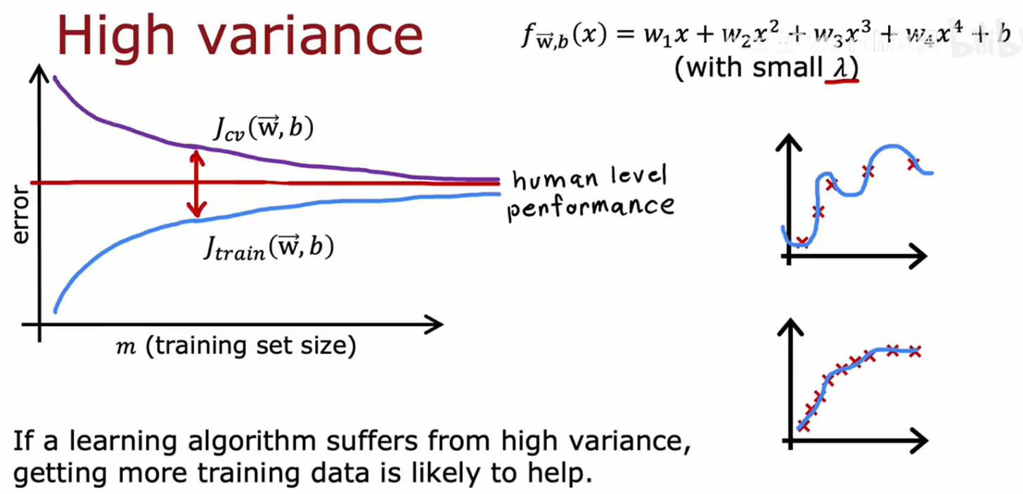 高方差:训练J低,验证J高,过拟合