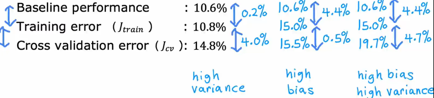 确定基准性能方法:1.统计人类的一般水平2.别人的算法表现3.根据自己经验期望的结果