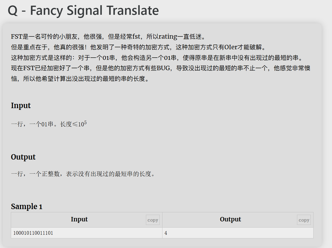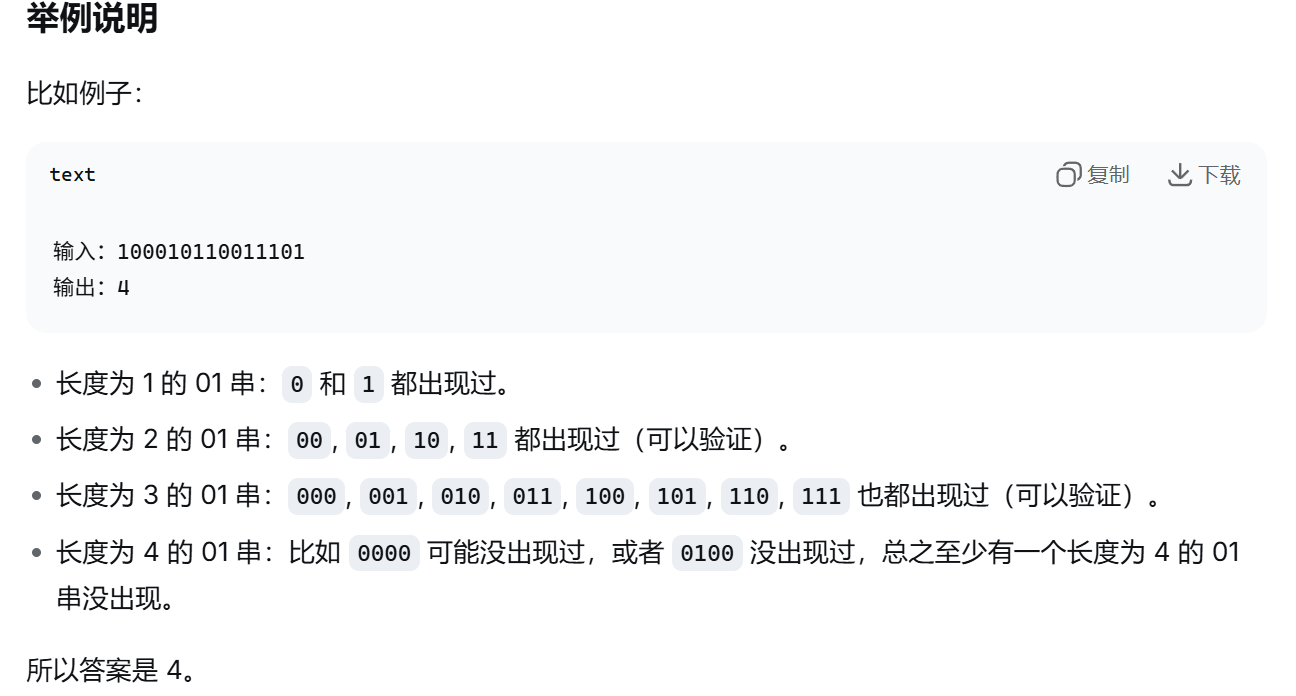 bool solve(int x){map<string,i64> m;for(int i=0;i<=len-x;i++){m[s.substr(i,x)]++;}if(m.size()==(1<<x)) return 1;else return 0;