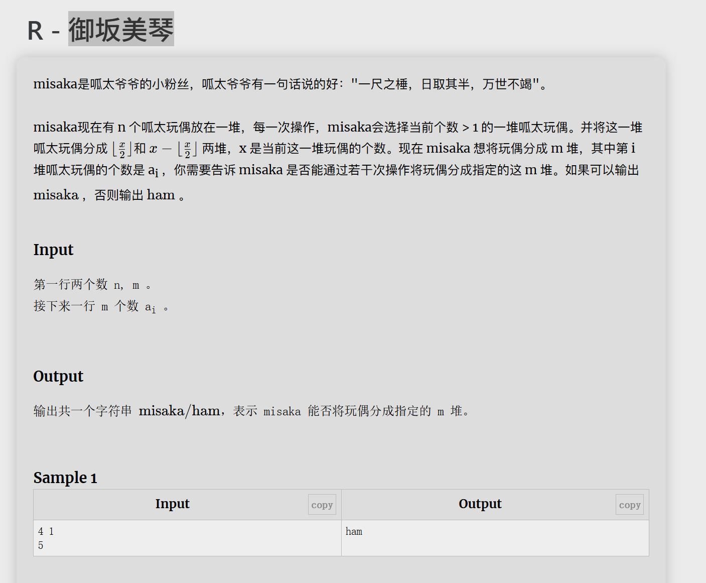 int main(){cin>>n>>m;for(i64 i=1;i<=m;i++){cin>>x;mp[x]++;sm+=x;}if(sm!=n){cout<<"ham"<<endl;}else if(dfs(n)&&mp.size()==0){cout<<"misaka"<<endl; }else{cout<<"ham"<<endl;}return 0;