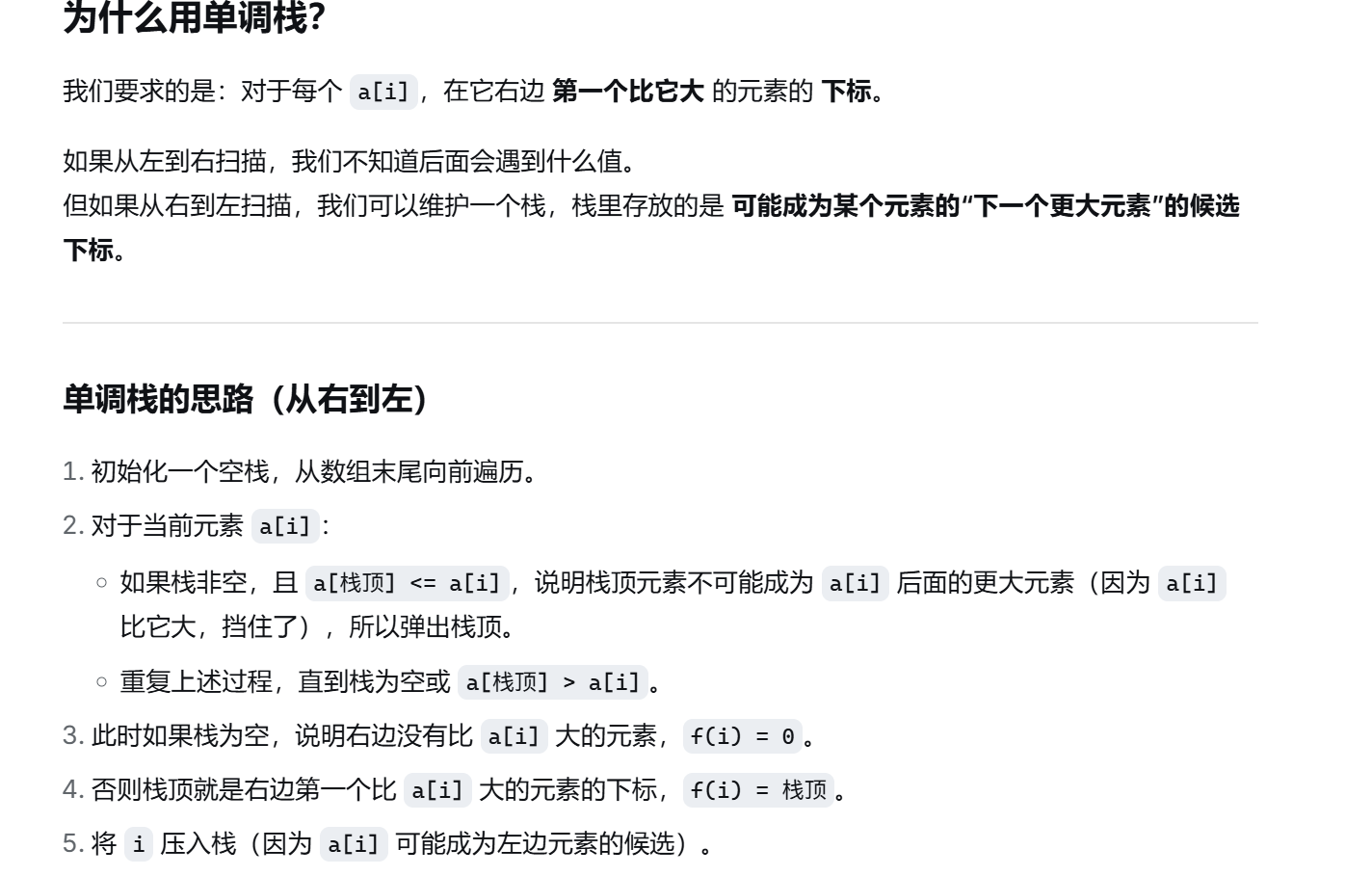 首先,单调栈不是存放数组本身,而是存放下标!其次,单调栈从后往前读,而不是从前往后读。