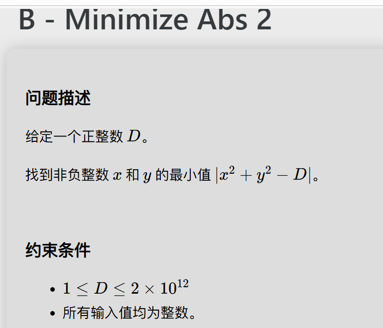 int main() {cin>>n;for(i64 i=0;i<=(i64)sqrt(n);i++){tmp=n-i*i;if(tmp<0) continue;//tmp表示y方ya=(i64)sqrt(tmp);yb=(i64)sqrt(tmp)+1;//cout<<tmp<<' '<<abs(i*i+ya*ya-n)<<' '<<abs(i*i+yb*yb-n)<<endl;rgans=min(abs(i*i+ya*ya-n),abs(i*i+yb*yb-n));ans=min(rgans,ans);}cout<<ans;return 0;