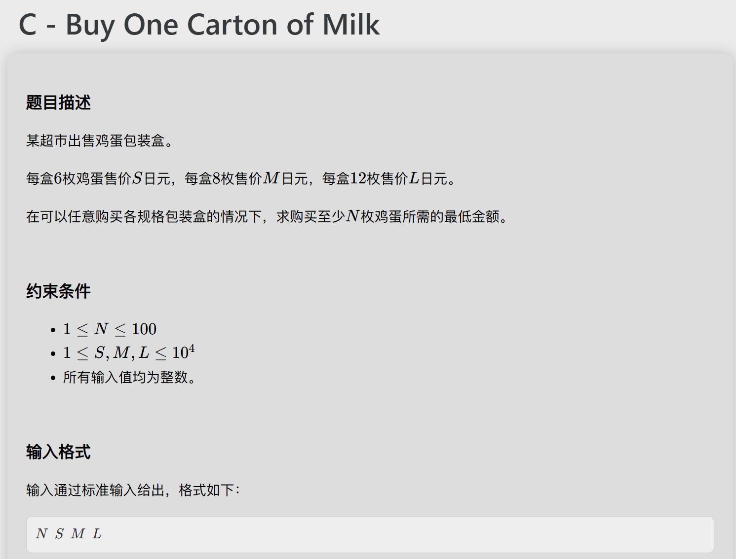 int main() {cin>>n>>s>>m>>l;init();for(int i=0;i<=n;i++){if(dp[i]==mx) continue;if(i+6<=n+11) dp[i+6]=min(dp[i+6],dp[i]+s);if(i+8<=n+11) dp[i+8]=min(dp[i+8],dp[i]+m);if(i+12<=n+11) dp[i+12]=min(dp[i+12],dp[i]+l);//平行关系,不是else,因为上面执行的下面也能执行,公倍数则两个都得比较。 }//这段代码意思是不需要我们每个点都去算,而是我们只需要去算临界的节点,其它非节点都是mxfor(int i=n;i<=n+11;i++){ans=min(ans,dp[i]);//cout<<dp[i]<<' ';} cout<<ans;return 0;