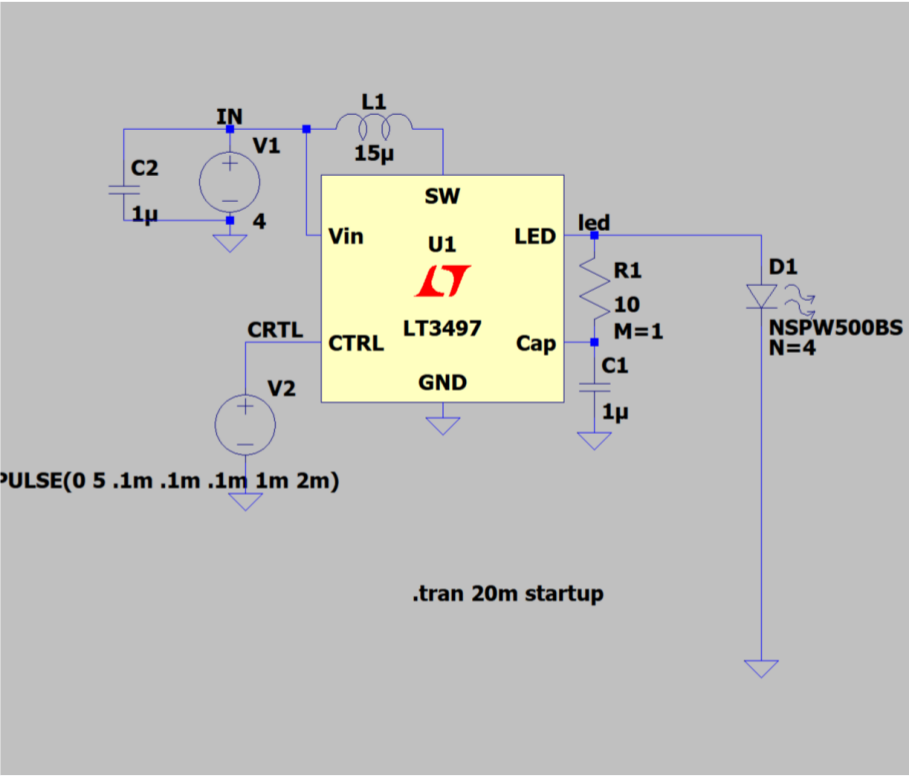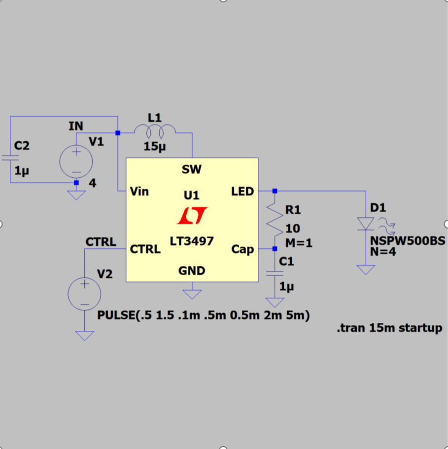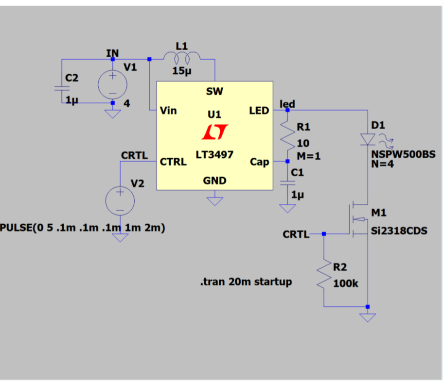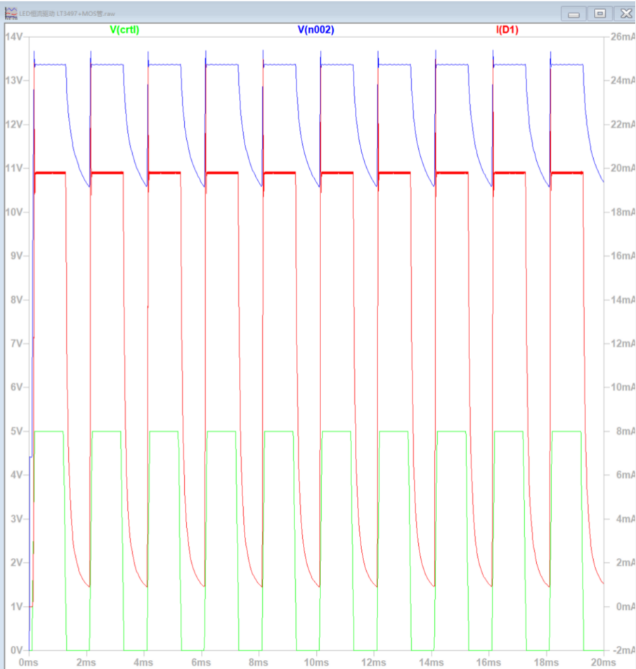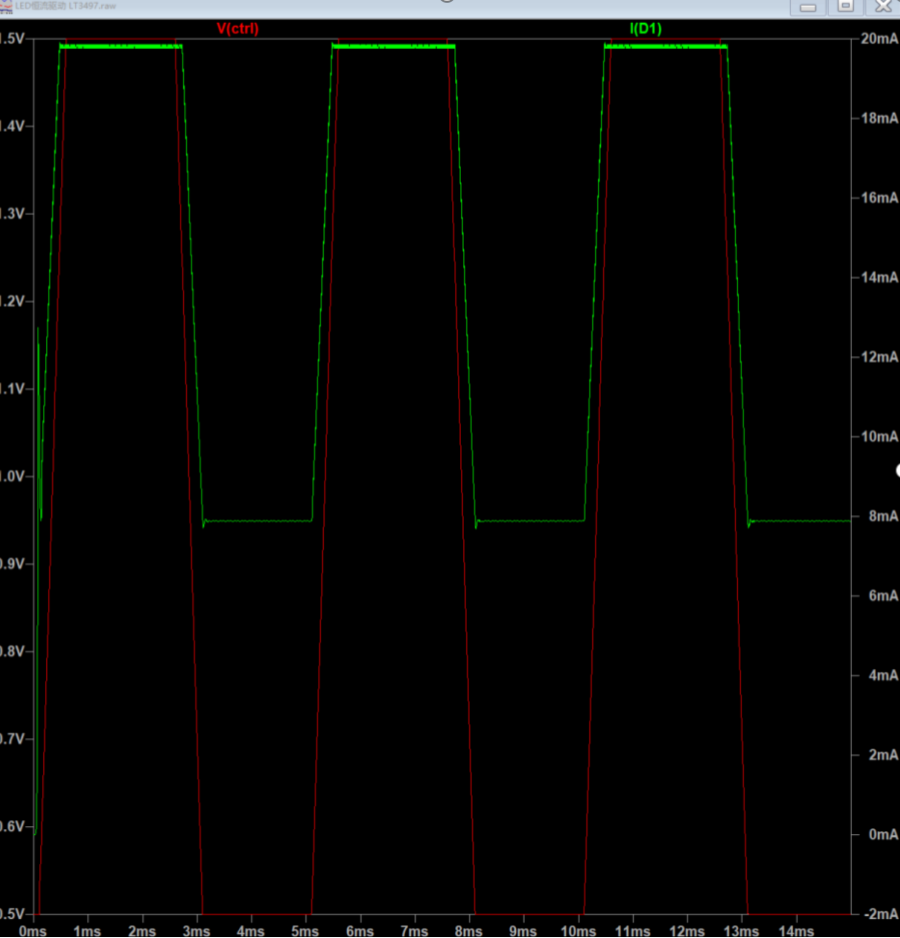 仿真结果如上图所示,我故意将斜率放大,能看到LED的电流是随着V(CRTL)变化而变化的,但是直流是只给一个固定的电平,我这里为了显示出CRTL的调光功能,故意是做成这样的波形,平常使用直接按规格书提供合适的电平即可。