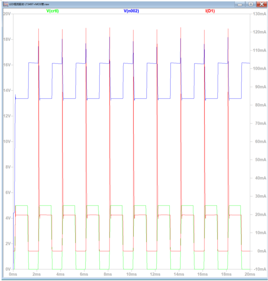观察波形电流和控制电压基本上同时开启关断的,假设去掉这个MOS管,如下一个仿真,在电流还没有完全消失的时候,就有起来了,这会造成你想让LED灭的时候但是却没有灭掉,所以要加这个MOS管,同时控制开启和关断。