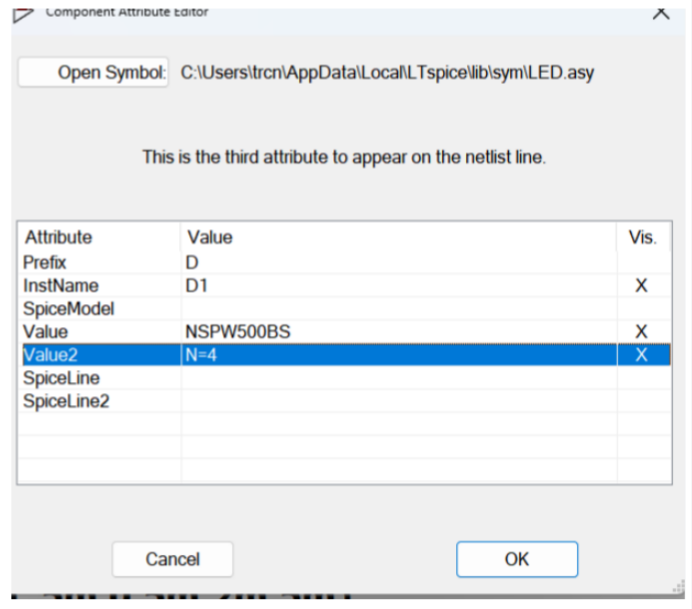 PS:仿真中,关于LTSpice有个有趣的应用,即仿真图中的N=4,表示4个LED串联,Ctrl+鼠标右击LED,弹框中修改Value即可,另外M表示并联可以给电阻使用,(M可以给电容使用,这个我没验证),原文地址: