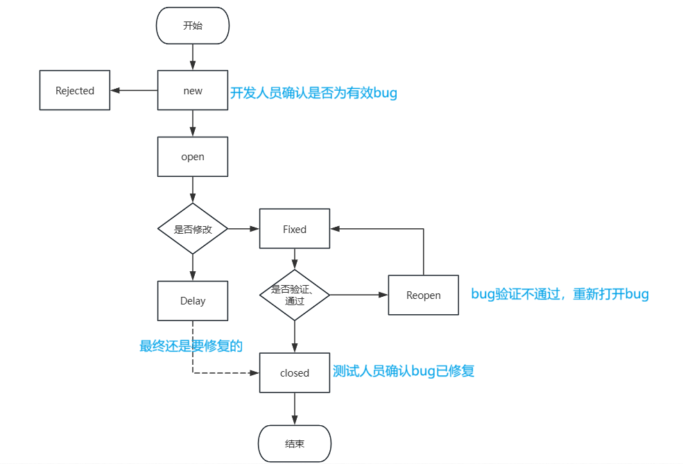 - Reoped:如果验证bug仍然存在,则需要重新打开bug,开发人员重新修改。