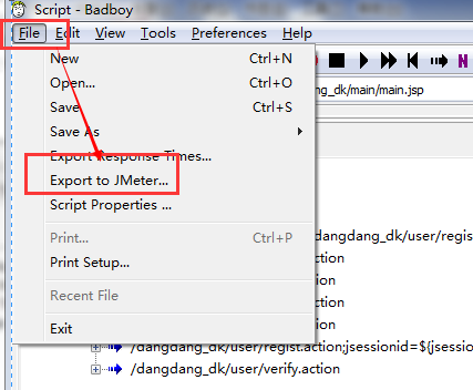 4.录制完毕后,就点击停止按钮,也就是红色按钮,然后点击头部的:File--->Export to JMeter,就能把你刚刚录制的脚本转化为Jmeter脚本了,如下所示: