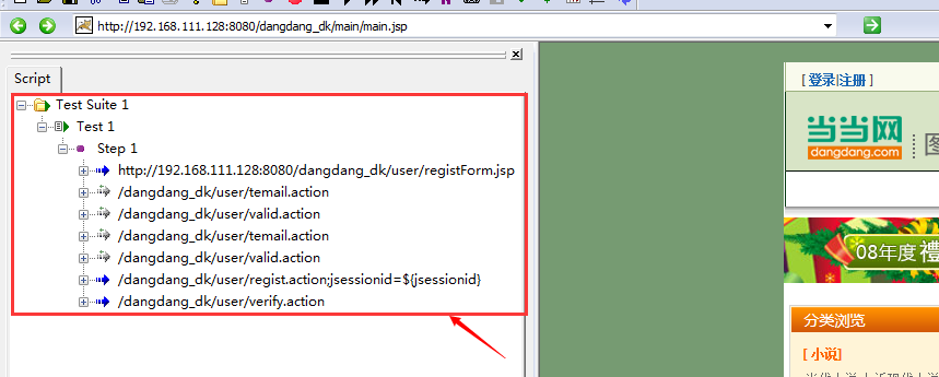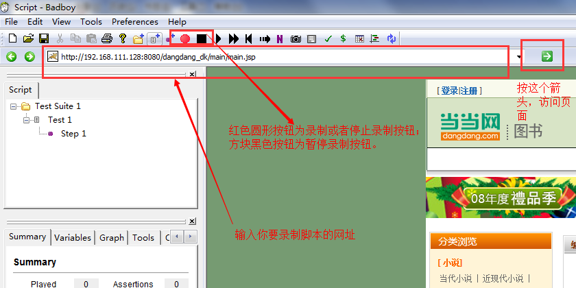 3.开始在badboy提供的浏览器上面进行操作,确保你自己已经打开了录制按钮哦~badboy会把你的操作都一步一步记录下来,你可以在左侧看到具体的操作记录,如下所示: