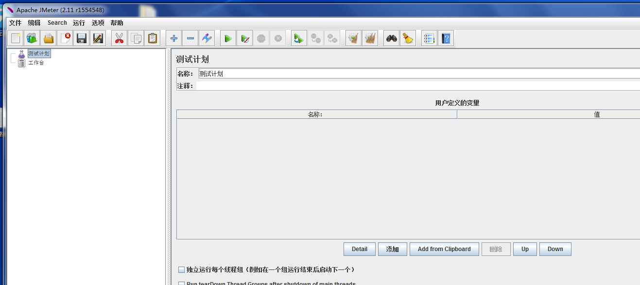 3)然后点击Jmeter目录下bin文件夹里的jmeter.bat就可以打开Jmeter,具体最后打开的界面如下: