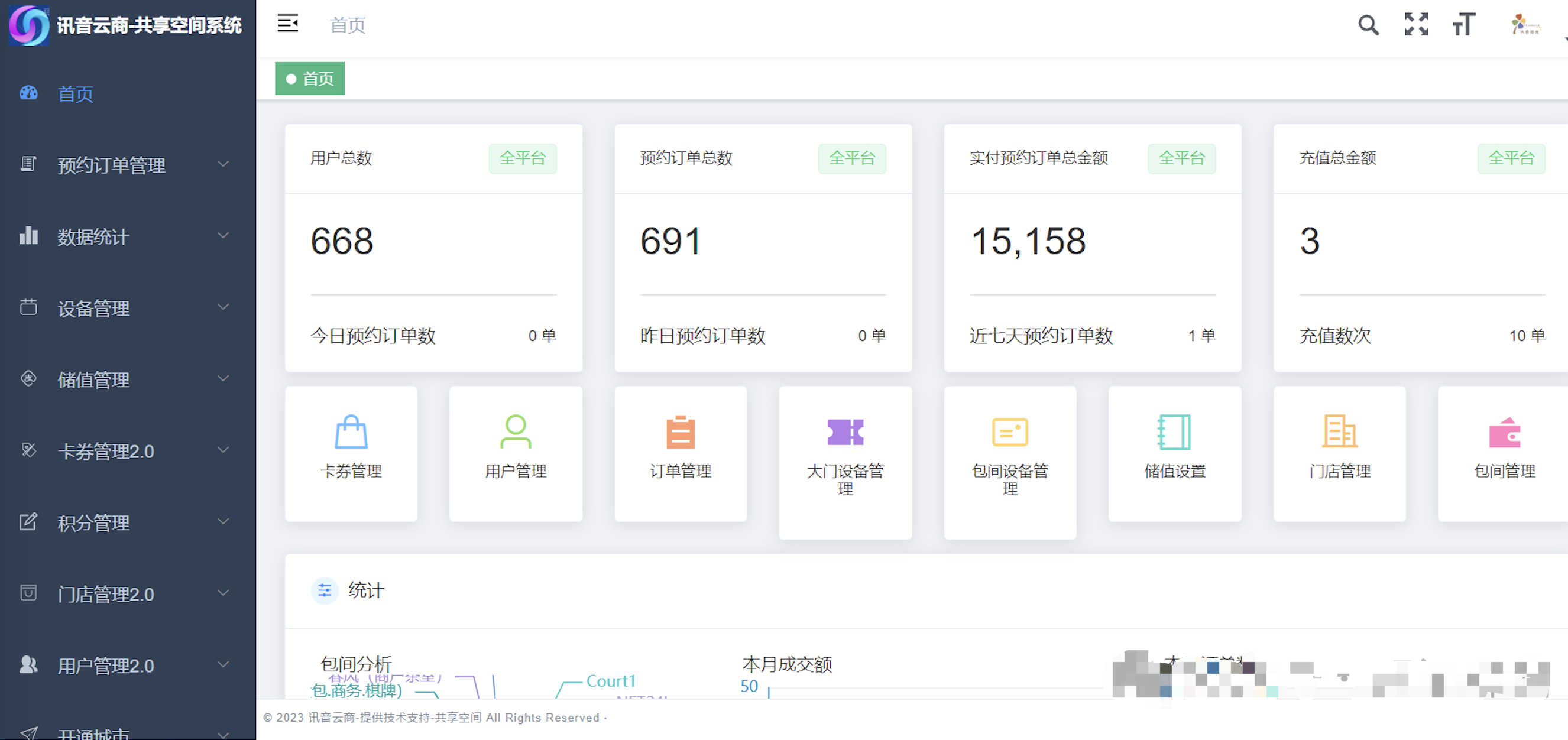 2. 首页面板,统计用户总数、预约订单总数、实付预约订单总金额、充值总金额、今 日预约订单数、昨日预约订单数、近七天预约订单数、充值数次、统计包间分析饼图、本月成交额、本月订单数趋势图