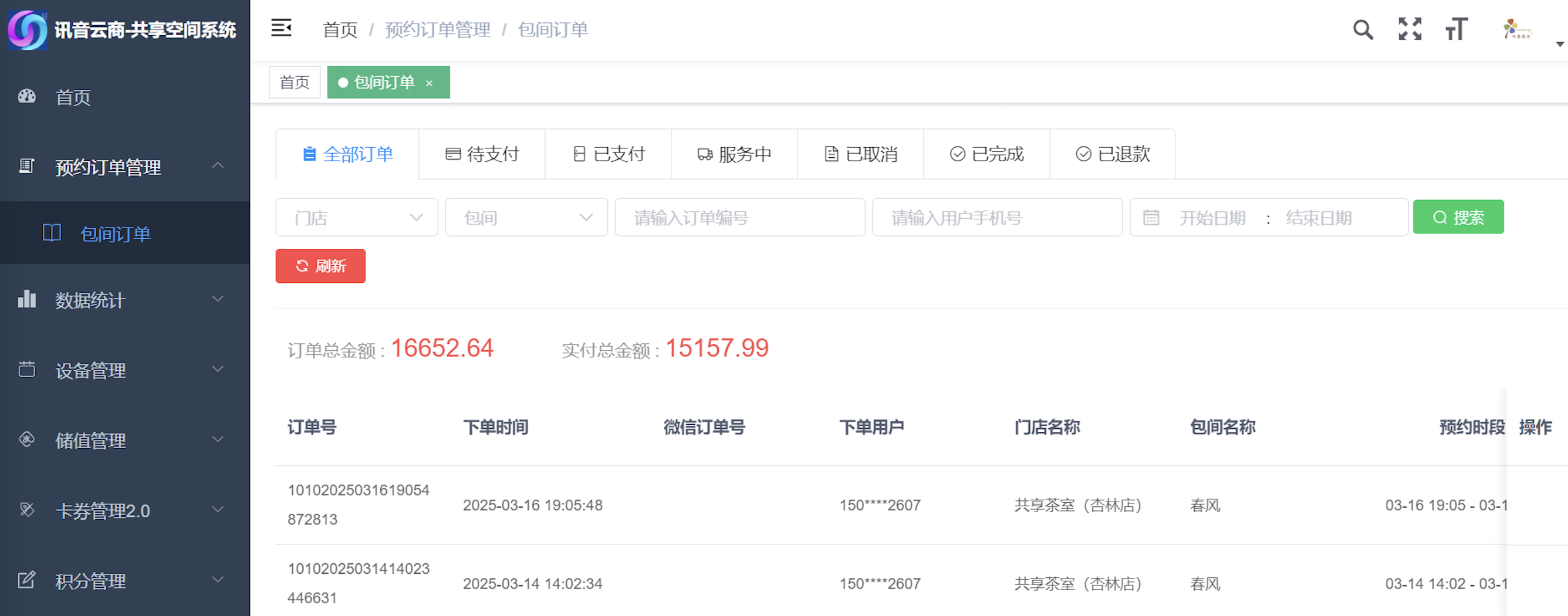 11.预约订单管理,查询所有用户预约订单,可根据门店,门店下的包厢、订单号、用户手 机、开始、结束时间查询、统计订单总金额、分账信息、是否代客下单
