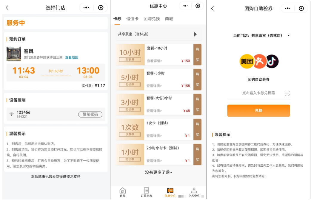 主要功能:包含小时卡/次卡/优惠券、团购券兑换、自动分账结算、点单商城、用户充值、用户积分、会员等级权益体系,线上预约智能通断电、一键开门等分享奖励营销工具 。