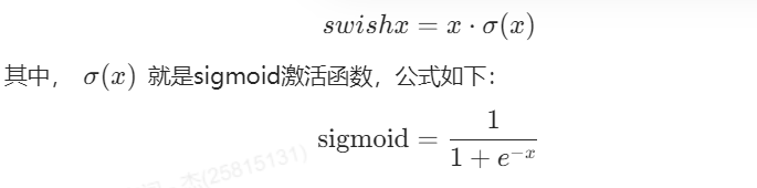 但是在很多网络中,使用的是swish x激活函数,swish x激活函数就是x乘以sigmoid激活函数,公式如下: