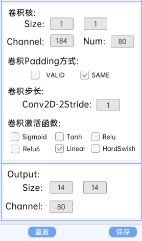 本bneck结构第一层Conv2D卷积核的宽、高、通道、个数是(1 x 1 x 80 x 184),padding方式为SAME,步长为1,经过batchNorm进行归一化,以及h-swish[x]激活函数,经计算可知,输出特征矩阵为(14 x 14 x 184)。