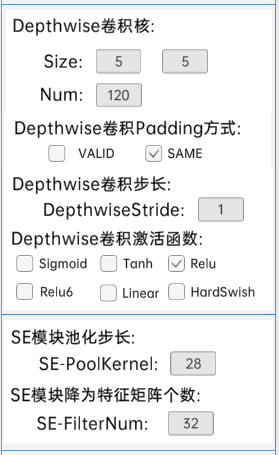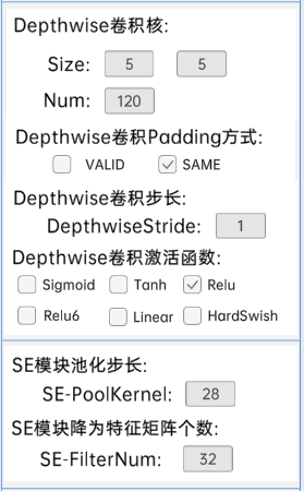 本bneck结构第三层SE模块,包含AvgPool、FC1以及FC2,其中,AvgPool池化核大小为(28 x 28),FC1的节点个数是32,FC2的节点个数是120。