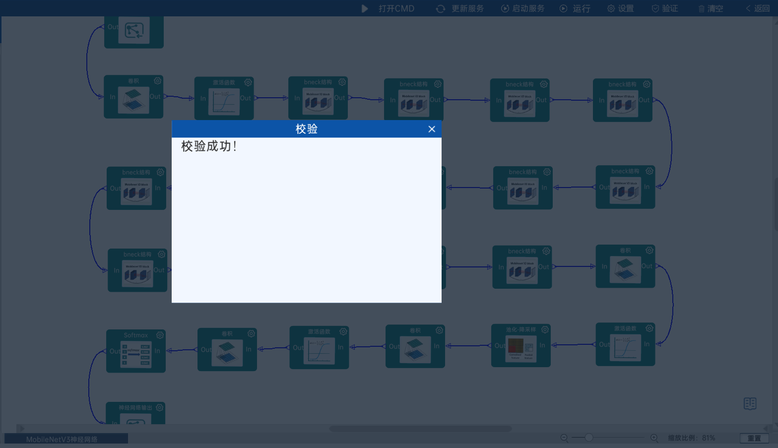本实验主要学习MobileNetV3的网络的相关知识,最后需要进行点击“验证”,验证成功即代表网络结构连接是正确的。