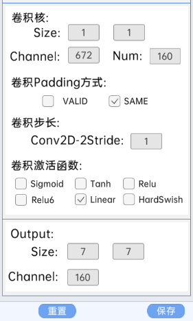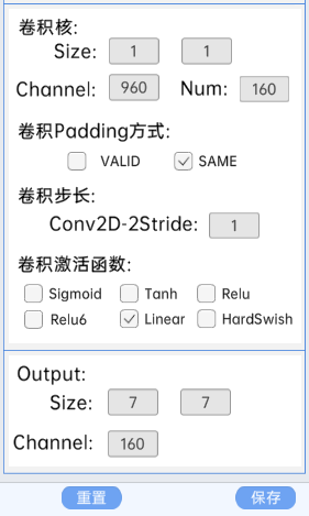 输入特征矩阵是(7 x 7 x 160),本层卷积核的宽、高、通道、个数是(1 x 1 x 160 x 960),步长为1,padding方式为SAME,经过计算可知,输出特征矩阵为(7 x 7 x 960)。