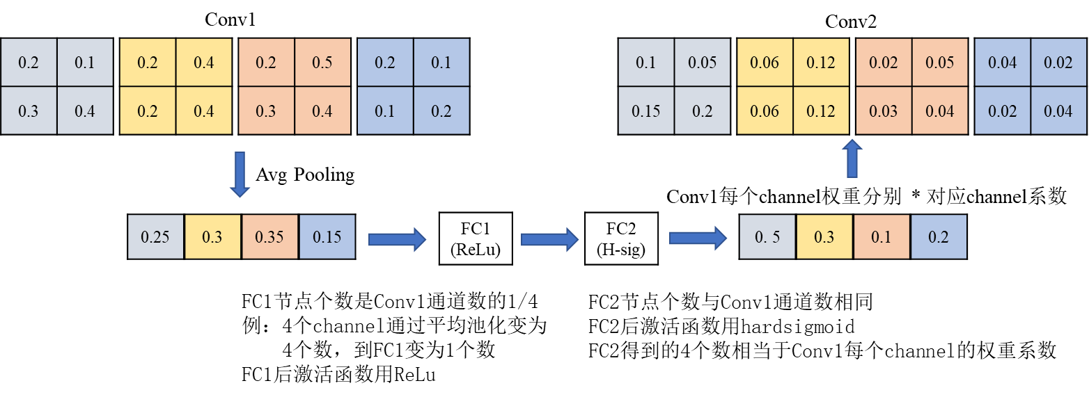 上图中,Conv1是DW卷积后得到的特征矩阵,该特征矩阵共4个channel,当然实际上多得多,这里只是简单举例,对每个channel进行平均池化操作,得到一个向量,接下来要经过第一次全连接层,全连接层的激活函数为Relu,节点个数=1,即4个channel的1/4,接下来通过第二个全连接层和h-sigmoid激活函数,该激活函数在后续会讲到,节点个数为4,最后得到的向量要与Conv1的每一个元素进行相乘,例如Conv1左上角的0.2,与得到的第一个channel的系数0.5进行相乘,得到Conv2的左上角的0.1,以此类推,就完成了SE模块的功能。