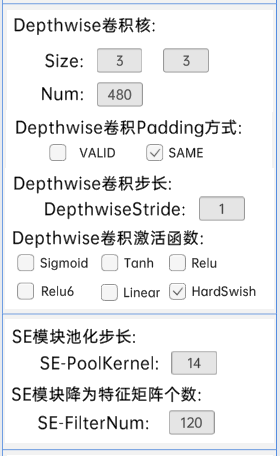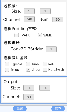本bneck结构第一层Conv2D卷积核的宽、高、通道、个数是(1 x 1 x 80 x 480),padding方式为SAME,步长为1,经过batchNorm进行归一化,以及h-swish[x]激活函数,经计算可知,输出特征矩阵为(14 x 14 x 480)。