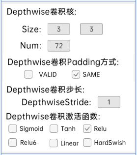 本bneck结构第二层DwiseConv2D卷积核的宽、高、个数是(3 x 3 x 72),padding方式为SAME,步长为1,经过batchNorm进行归一化,以及Relu激活函数,经计算可知,输出特征矩阵为(56 x 56 x 72)。