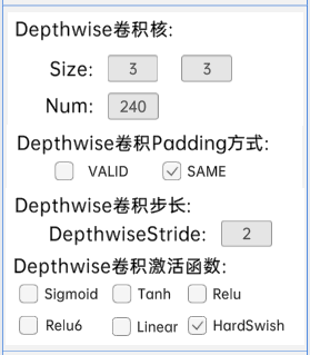本bneck结构第二层DwiseConv2D卷积核的宽、高、个数是(3 x 3 x 240),padding方式为SAME,步长为2,经过batchNorm进行归一化,以及h-swish[x]激活函数,经计算可知,输出特征矩阵为(14 x 14 x 240)。